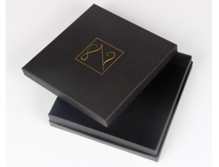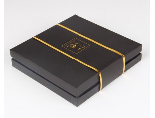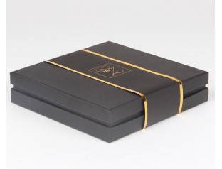 此款天地蓋帶圍邊禮品盒,選用黑卡紙裱1000g灰板,商標燙金。禮品盒采用經典的黑色作為整體色,搭配金色的LOGO,體現出簡約、整潔的設計理念。禮品紙盒黑色主體色調將金色Logo顯得十分顯眼,極具層次感。