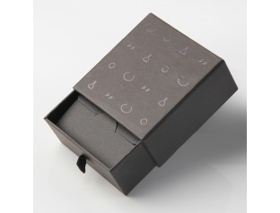 此款首飾包裝盒,采用了常見的開合型翻蓋盒的款式,材質是pu皮包膠胚,商標燙銀。首飾盒包裝整體用黑色作為底色,醒目的銀色LOGO位于盒子中心,黑白搭配,變得更加簡單和樸素首飾盒選用植絨裱EVA內托在保護好產品的同時,也彰顯其高檔大方。