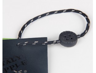 此款服裝吊牌制作,采用400g雙銅紙,商標燙銀服裝吊牌設計采用了綠色和黑色的搭配,能給人一種協調,美觀,大方的感覺。服裝吊牌制作加上尼龍圓繩的暗扣吊粒,簡單,清新。
